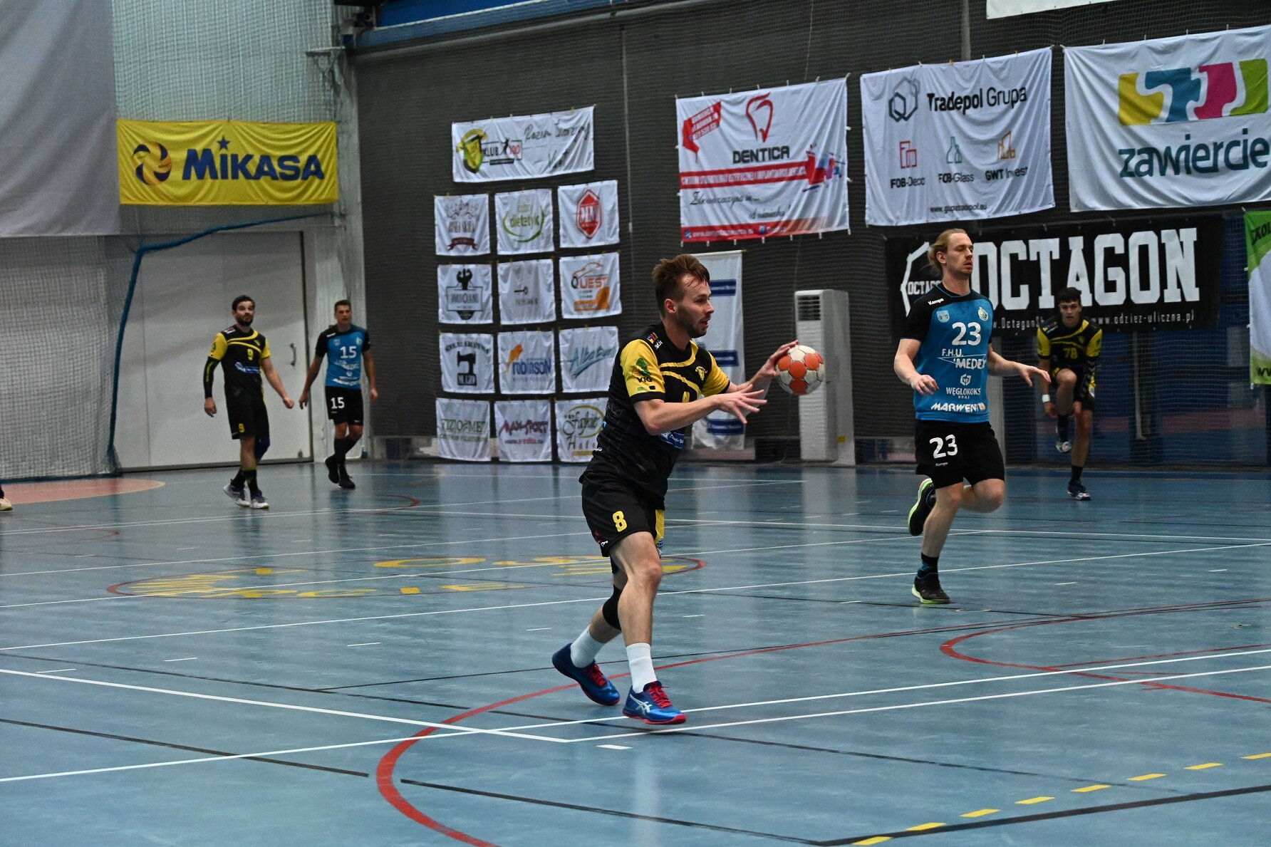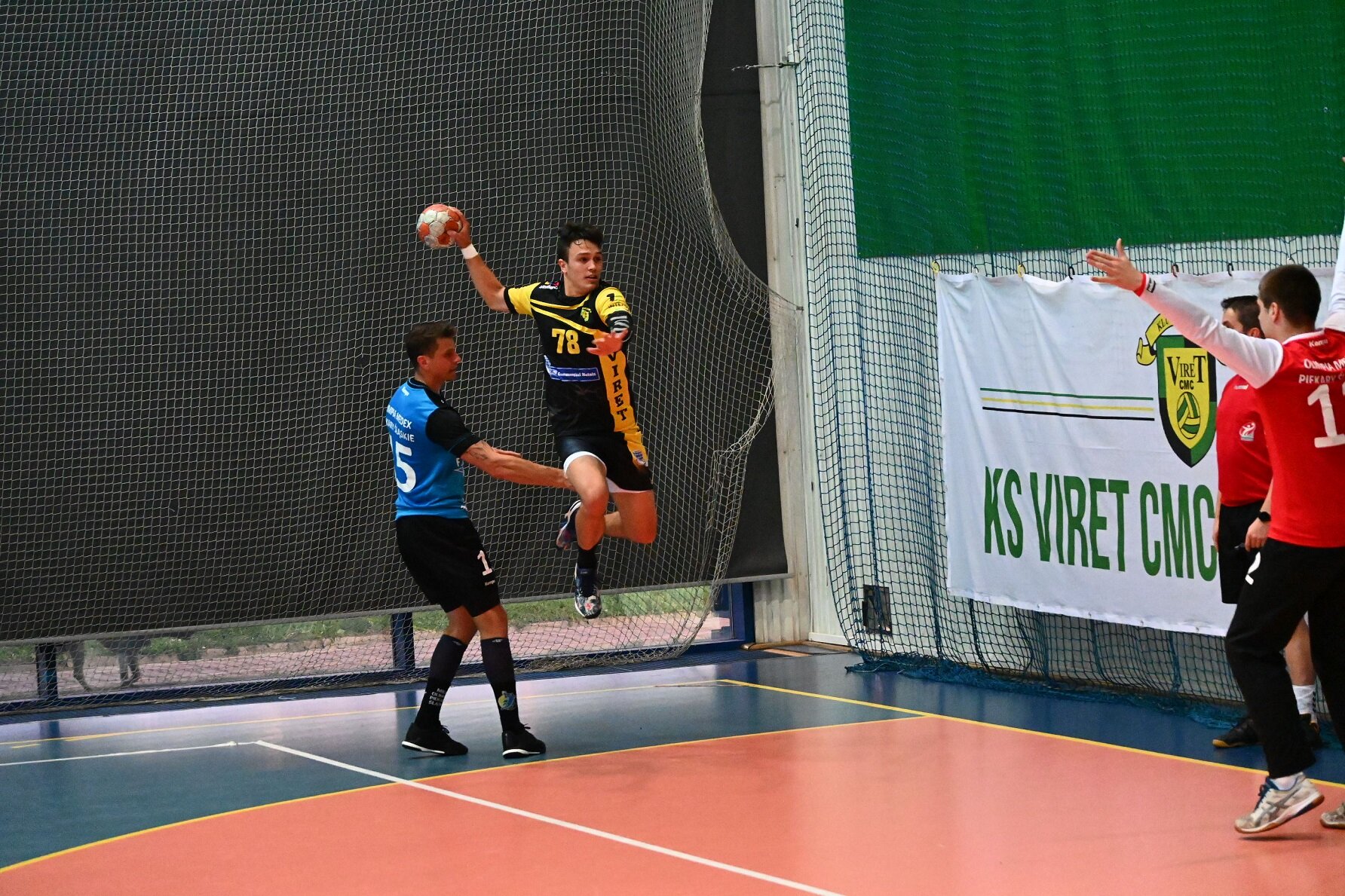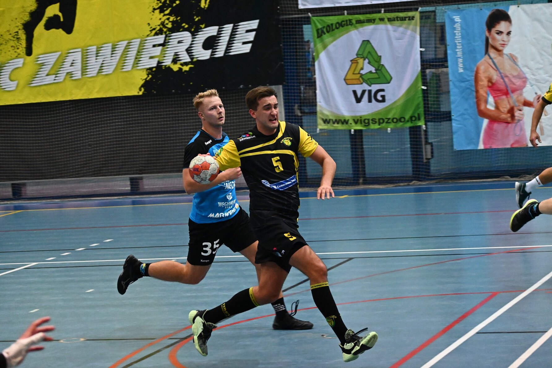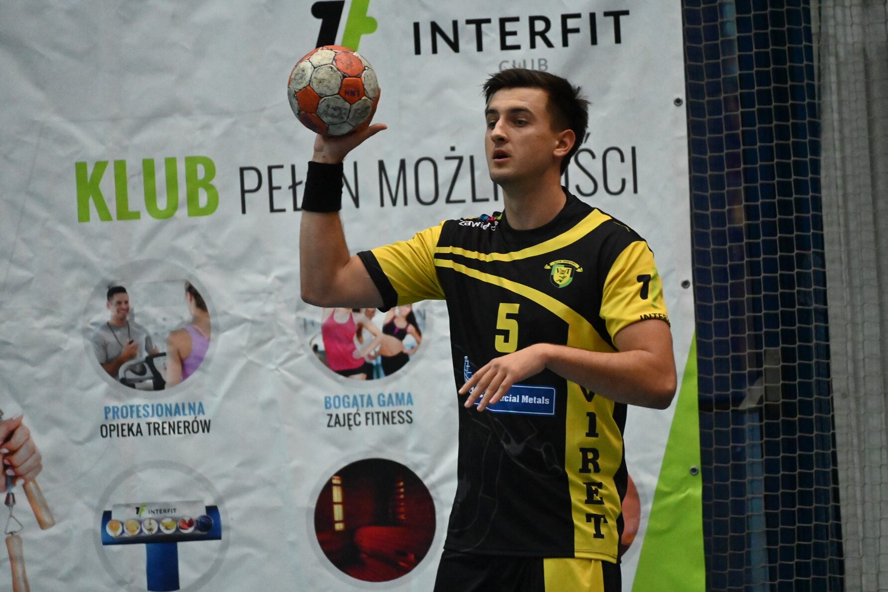 Sobotni (19.09.) mecz w Zawierciu na pewno nie należał do nudnych. Wynik zmieniał się jak w kalejdoskopie i tak naprawdę do ostatnich sekund meczu nie było wiadomo, kto będzie cieszył się z wygranej. Spotkanie lepiej rozpoczęła Olimpia Piekary Śląskie, która już w 6 minucie meczu prowadziła dwiema bramkami (2:4). Zawiercianie szybko wyrównali jednak wynik, aby w 13 minucie pozwolić rywalom odskoczyć na cztery trafienia (4:8). Przyjezdni byli w stanie budować przewagę głównie dzięki dobrej postawie Jana Widery. Bramkarz zatrzymał kilka rzutów zawierciańskich szczypiornistów i tym samym pozwolił swoim kolegom wyprowadzać skuteczne kontry. Viret CMC Zawiercie mógł natomiast liczyć na dobre interwencje Marcina Teterycza. W końcówce pierwszej połowy ciężar gry wziął na siebie Paweł Wójcik. Bramki zdobyte przez zawierciańskiego skrzydłowego pozwoliły gospodarzom wyjść na prowadzenie. Ważne trafienia zanotowali także Artur Makaruk i Damian Kapral. Viret CMC Zawiercie na przerwę schodził z trzybramkową przewagą (15:12).
