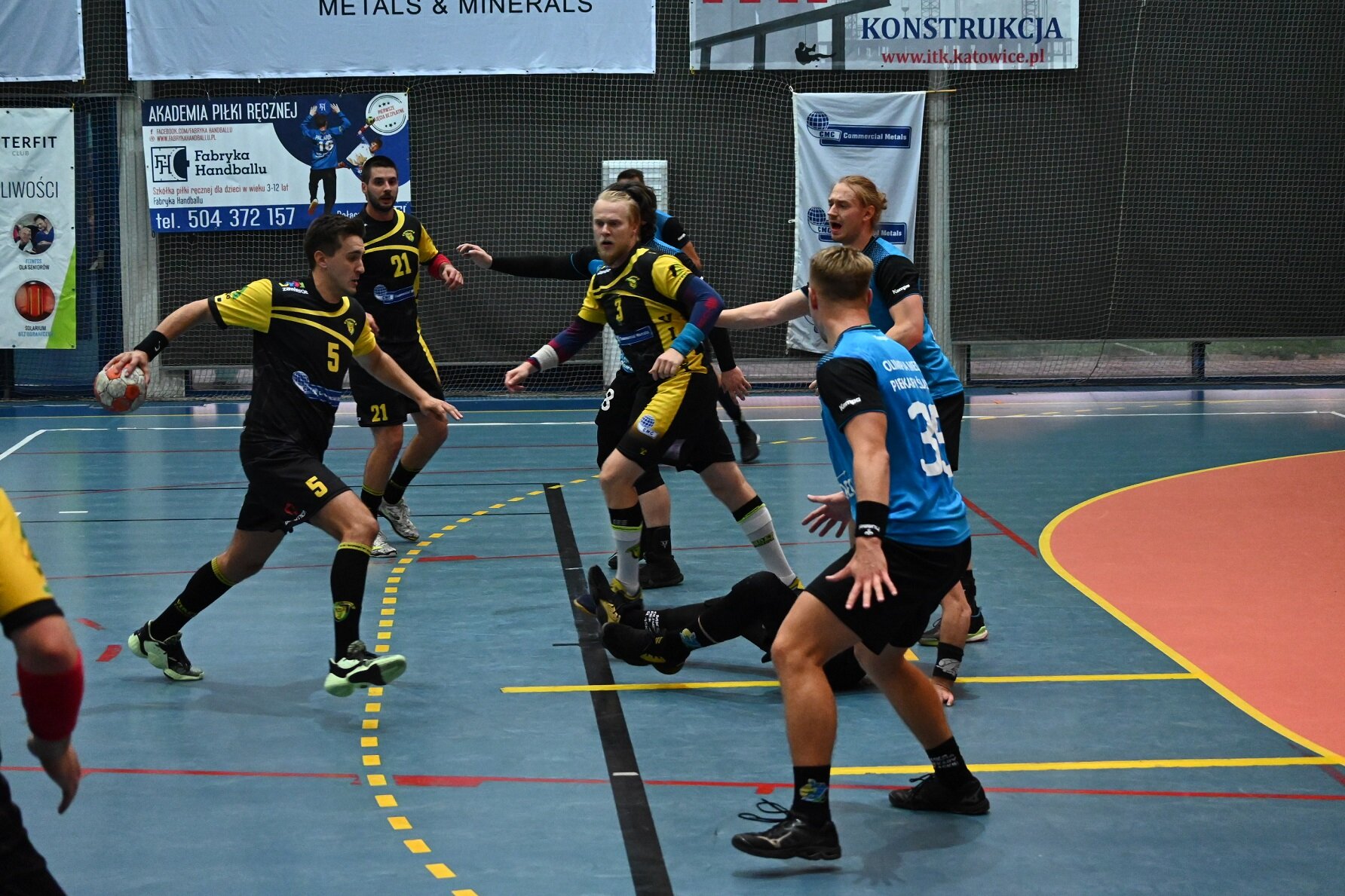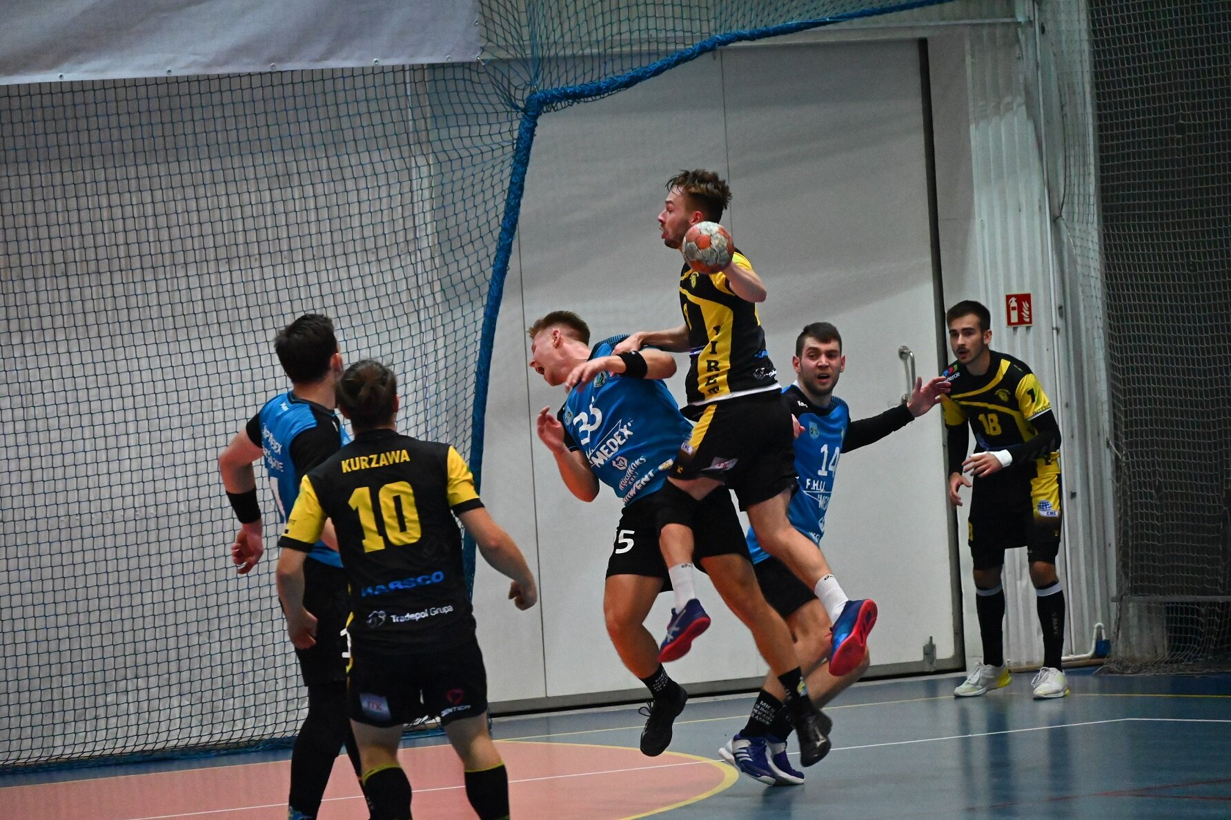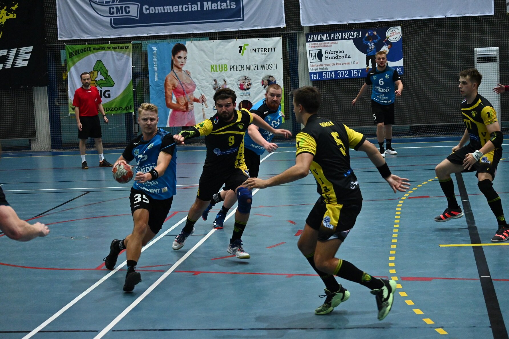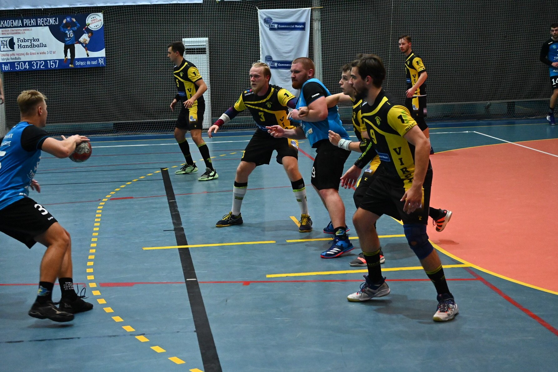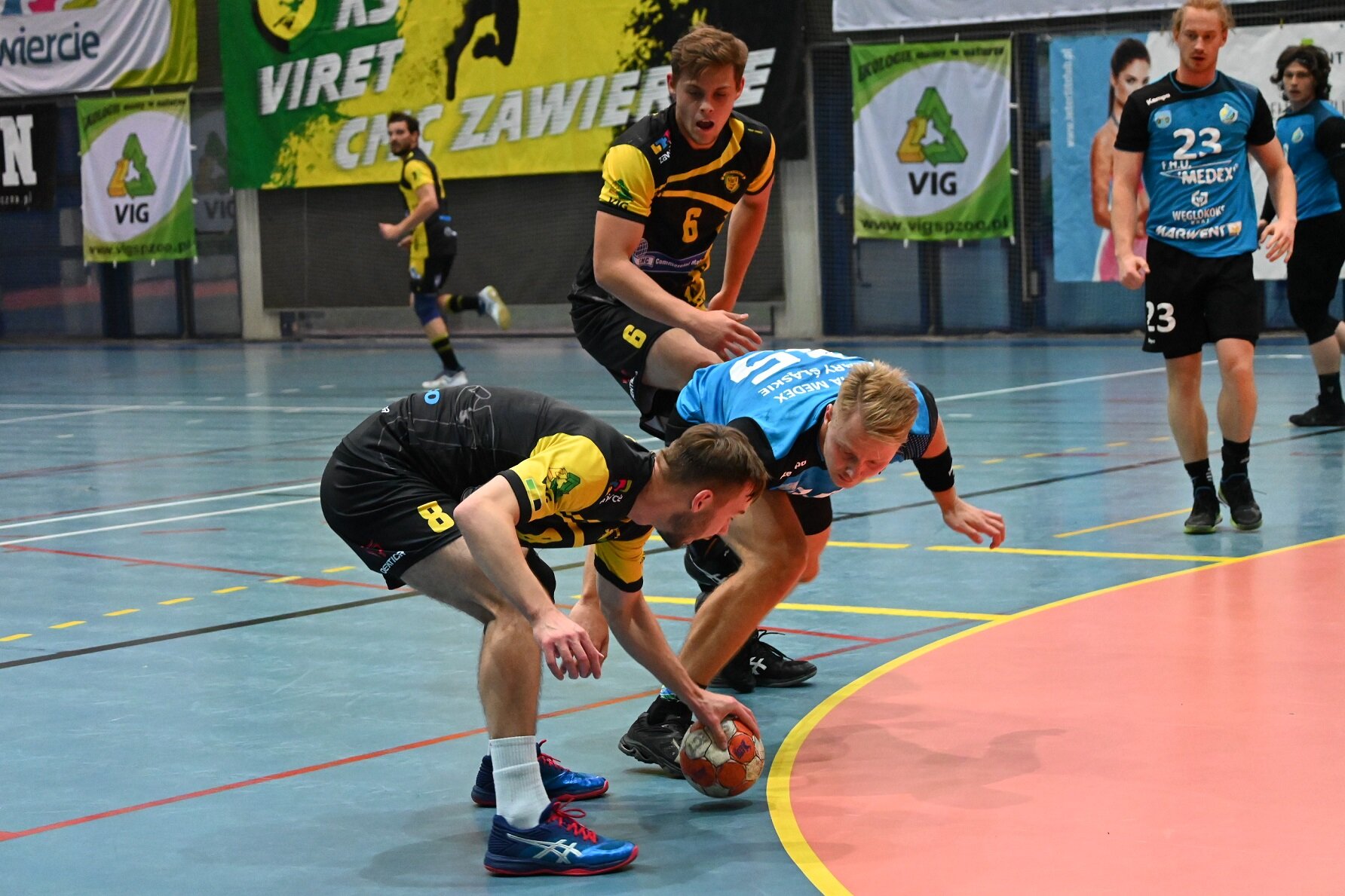 Sobotni (19.09.) mecz w Zawierciu na pewno nie należał do nudnych. Wynik zmieniał się jak w kalejdoskopie i tak naprawdę do ostatnich sekund meczu nie było wiadomo, kto będzie cieszył się z wygranej. Spotkanie lepiej rozpoczęła Olimpia Piekary Śląskie, która już w 6 minucie meczu prowadziła dwiema bramkami (2:4). Zawiercianie szybko wyrównali jednak wynik, aby w 13 minucie pozwolić rywalom odskoczyć na cztery trafienia (4:8). Przyjezdni byli w stanie budować przewagę głównie dzięki dobrej postawie Jana Widery. Bramkarz zatrzymał kilka rzutów zawierciańskich szczypiornistów i tym samym pozwolił swoim kolegom wyprowadzać skuteczne kontry. Viret CMC Zawiercie mógł natomiast liczyć na dobre interwencje Marcina Teterycza. W końcówce pierwszej połowy ciężar gry wziął na siebie Paweł Wójcik. Bramki zdobyte przez zawierciańskiego skrzydłowego pozwoliły gospodarzom wyjść na prowadzenie. Ważne trafienia zanotowali także Artur Makaruk i Damian Kapral. Viret CMC Zawiercie na przerwę schodził z trzybramkową przewagą (15:12).